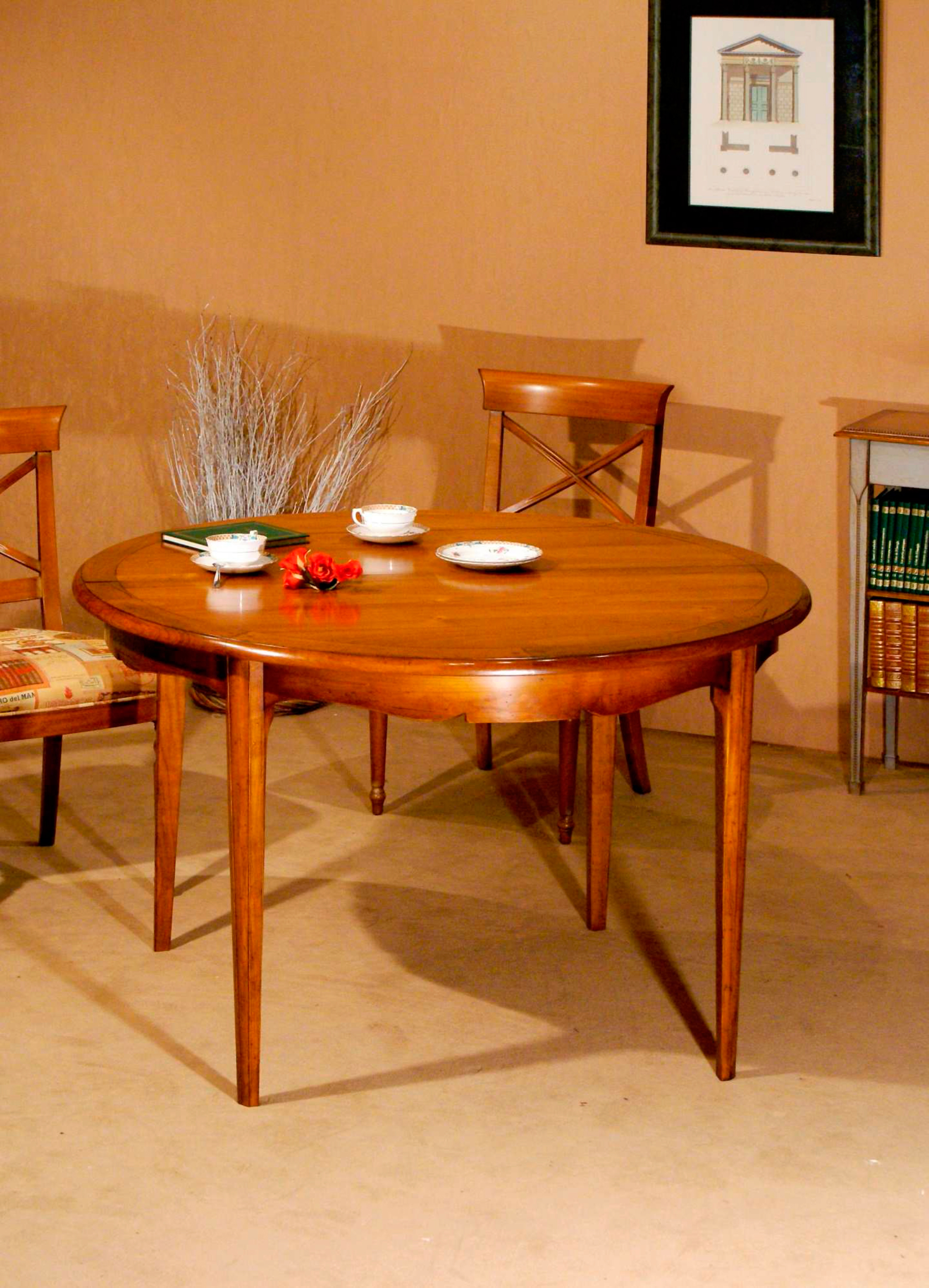 Table de repas ronde en bois massif, à allonge séparée, collection Héritage (assemblage spécifique en queue de billard avec panneaux rabotés à la main).